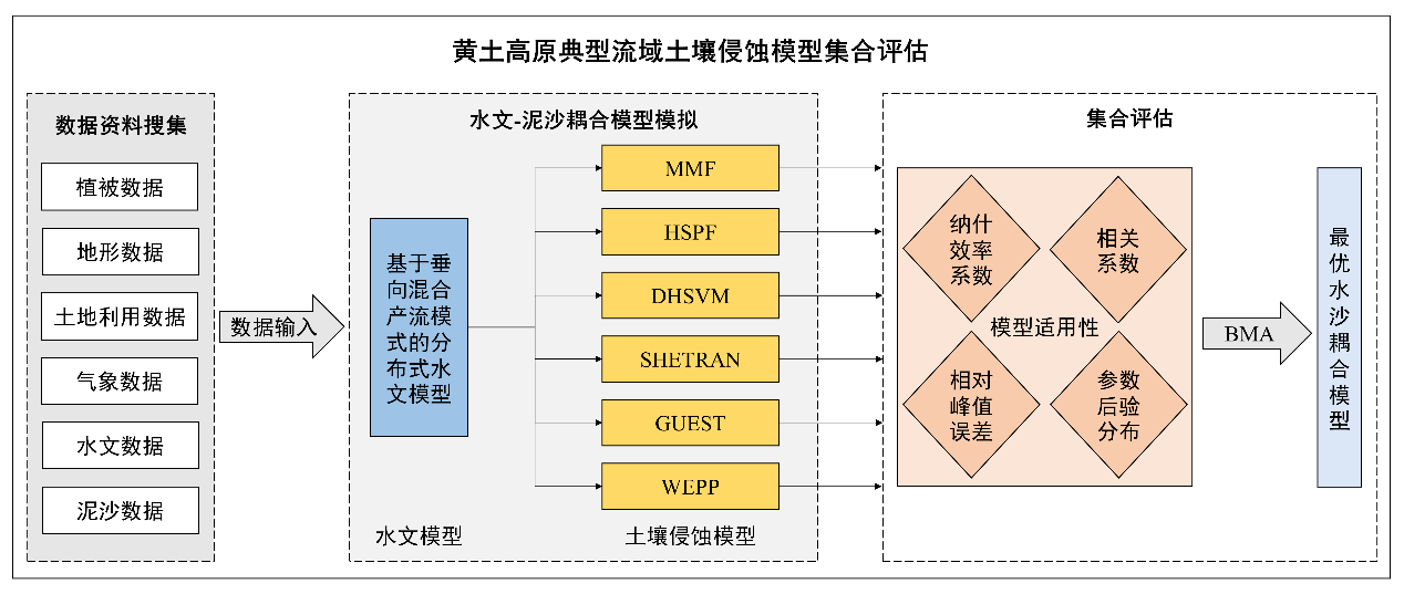 深入开展流域尺度水土流失评价与模拟可为量化流域土壤侵蚀的时空分布,识别重点侵蚀产沙热点区域提供技术方法。土壤侵蚀模型是土壤侵蚀研究的重点领域之一,是评估历史时期土壤侵蚀状况、预测未来土壤侵蚀变化趋势、设计和评估水土保持措施效益的主要工具。流域水沙集合评估技术集成了不同土壤侵蚀预报模型的优势,降低单一土壤侵蚀模型的误差,减少模拟结果的不确定性。
