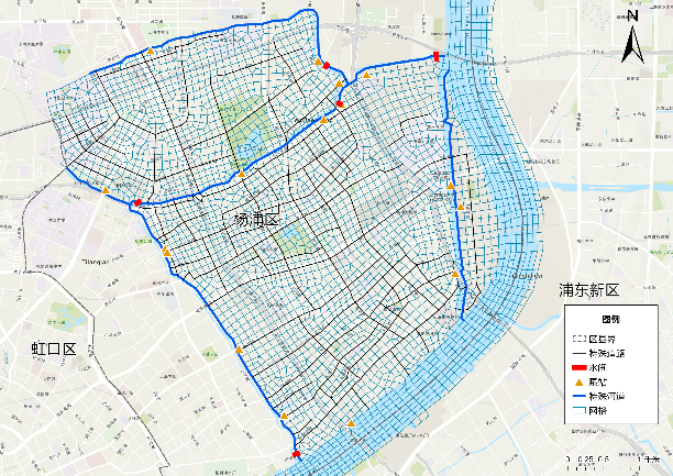 图2 上海市城市街区尺度模型网格通道和典型方案模拟洪涝风险要素分布图